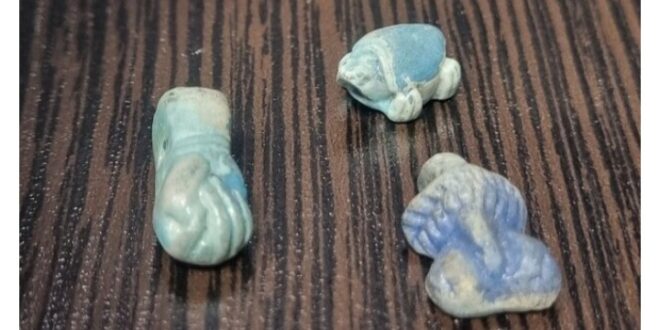 این اشیا به قدری ظریف و کوچک هستند که یک ذرهبین در ویترینی که اشیا به نمایش درآمده، تعبیه شده است. با ذرهبین این سه شی را با دقت مینگرم، لاک پشتی به رنگ لاجورد، دستی مشت شده و پیکرک انسانی!
